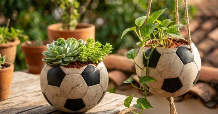 Una de las formas más populares de reciclaje es convertir la pelota en una maceta original para el jardín o el balcón. Al realizar un corte en uno de los lados, se genera una abertura ideal para colocar tierra y una planta decorativa. El diseño hexagonal típico del balón aporta un toque llamativo que combina perfectamente con ambientes exteriores modernos en cualquier ciudad de Colombia.
