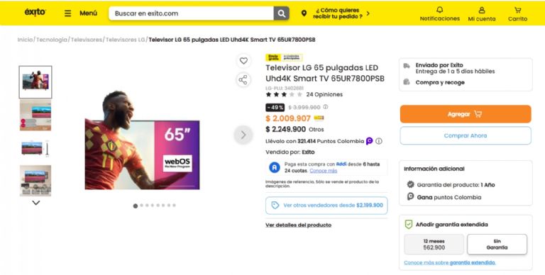 El Televisor LG 65 Pulgadas LED UHD 4K Smart TV, modelo 65UR7800PSB, está disponible en Éxito a un precio especial de $2.009.907 con la tarjeta Éxito con un suculento descuento de casi 50%. Para los que no tienen la tarjeta de la cadena de supermercado pueden usar diversas tarjetas bancarias por un importante descuento con un precio final de $2.249.900. Cabe destacar que cualquiera sea el medio de pago para adquirir el Smart TV, el mismo cuenta con un año de garantía de fábrica. Para obtener más información y aprovechar esta oferta haga click aquí, visite la tienda en línea de Éxito o acércate a una de sus sucursales.