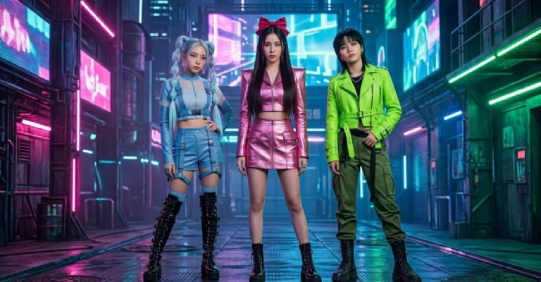 La posibilidad de la inteligencia artificial de mezclar mundos permite que el diseño geométrico y simple de Cartoon Network evolucione hacia el maximalismo glamuroso de Seúl. Mientras que las originales se definen por formas básicas y colores planos, el universo de las Guerreras K-pop exige una estética fotorrealista basada en el "tech-wear" y el maquillaje gráfico. La IA actúa como un puente que toma la "sustancia X" y la traduce en una "pinta" urbana de lujo, llena de hebillas, texturas metalizadas y una presencia escénica imponente.