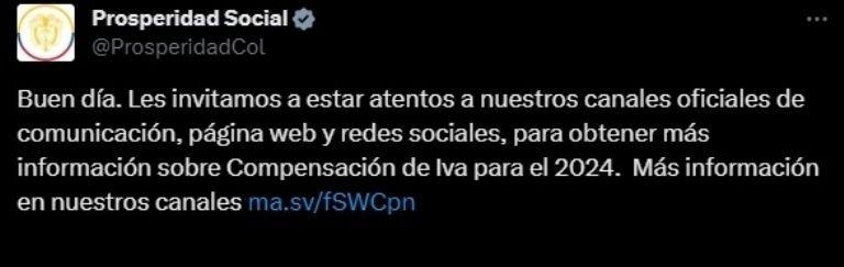 Además puedes conocer información llamando sin costo al número 01-8000-95-1100 en todo el territorio nacional. También puedes verificar si has recibido la suma en Supergiros y Daviplata. Si bien son muchas las familias que no lograron cobrar la suma, la gran mayoría pretende saber si este beneficio seguirá vigente durante el 2024 y el organismo respondió: "Les invitamos a estar atentos a nuestros canales oficiales de comunicación para obtener más información sobre Compensación de IVA para el 2024".