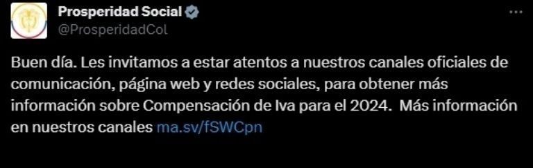 "Les invitamos a estar atentos a nuestros canales oficiales de comunicación, página web y redes sociales, para obtener más información sobre Compensación de IVA para el 2024", escribió la entidad e insistió en que "si por algún motivo no alcanzaron a cobrar los ciclos 4, 5 y 6", estén "pendientes a nuestros canales para validar una posible reliquidación".