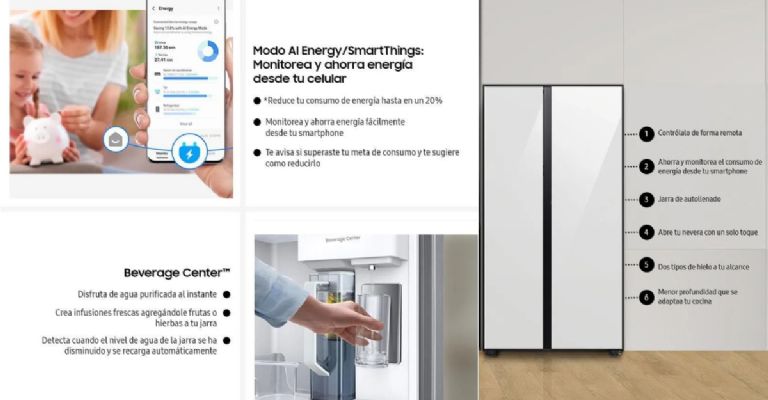 Este nevecón de la línea Bespoke no sólo destaca por su tamaño, sino por su capacidad para cuidar el recibo de la luz. Gracias al "AI Energy Mode" y la aplicación SmartThings, el equipo aprende de sus patrones de uso para optimizar el funcionamiento del compresor, reduciendo el consumo de energía hasta en un 10%. Esto es vital para las familias colombianas que buscan eficiencia sin sacrificar la frescura de sus alimentos durante todo el mes.
