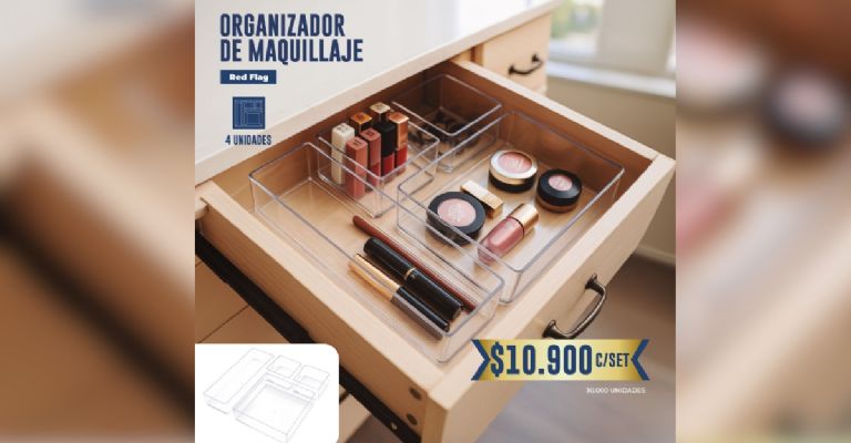 Tiendas D1 lanzó un organizador de maquillaje Red Flag de cuatro unidades por $10.900 pesos en Colombia este marzo para optimizar el orden en cajones y tocadores.