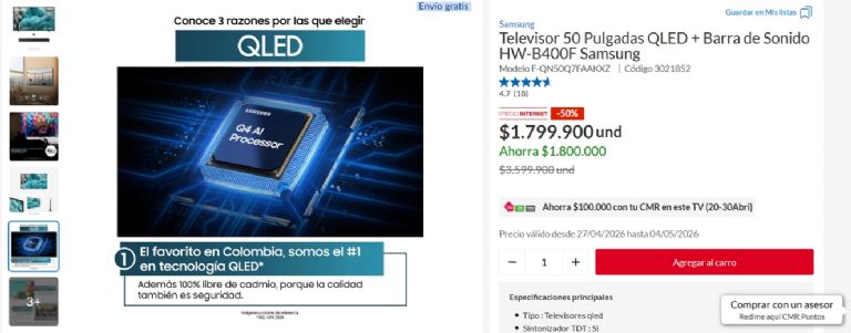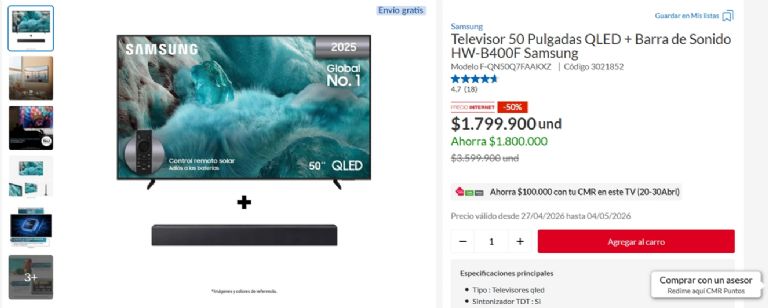 La cadena lanzó una oferta destacada en tecnología con un combo que incluye un Smart TV QLED de 50 pulgadas de Samsung junto a una barra de sonido, con un descuento que alcanza el 50%. Según la publicación oficial, el precio del producto pasó de $3.599.900 a $1.799.900, lo que representa un ahorro cercano a los $1.800.000, una rebaja significativa dentro del segmento de televisores de gama media-alta.